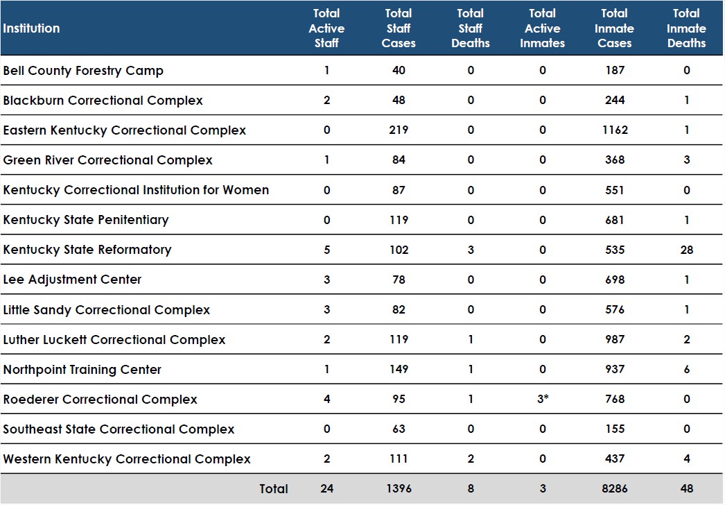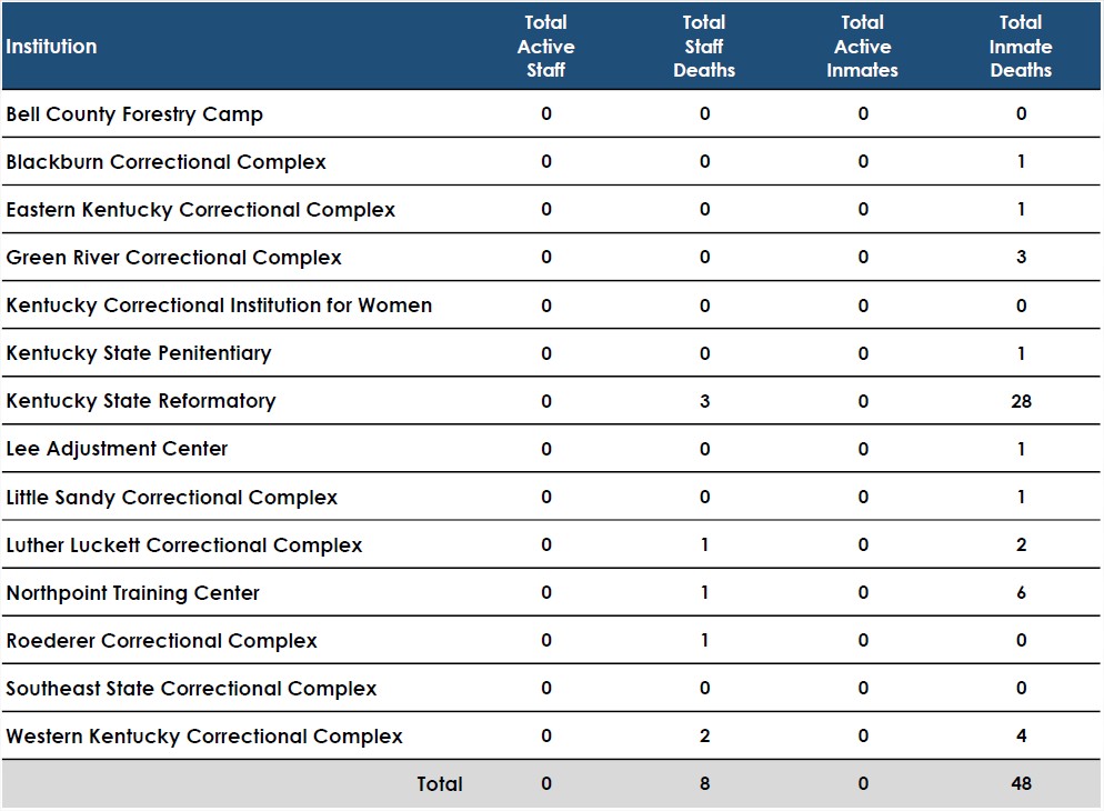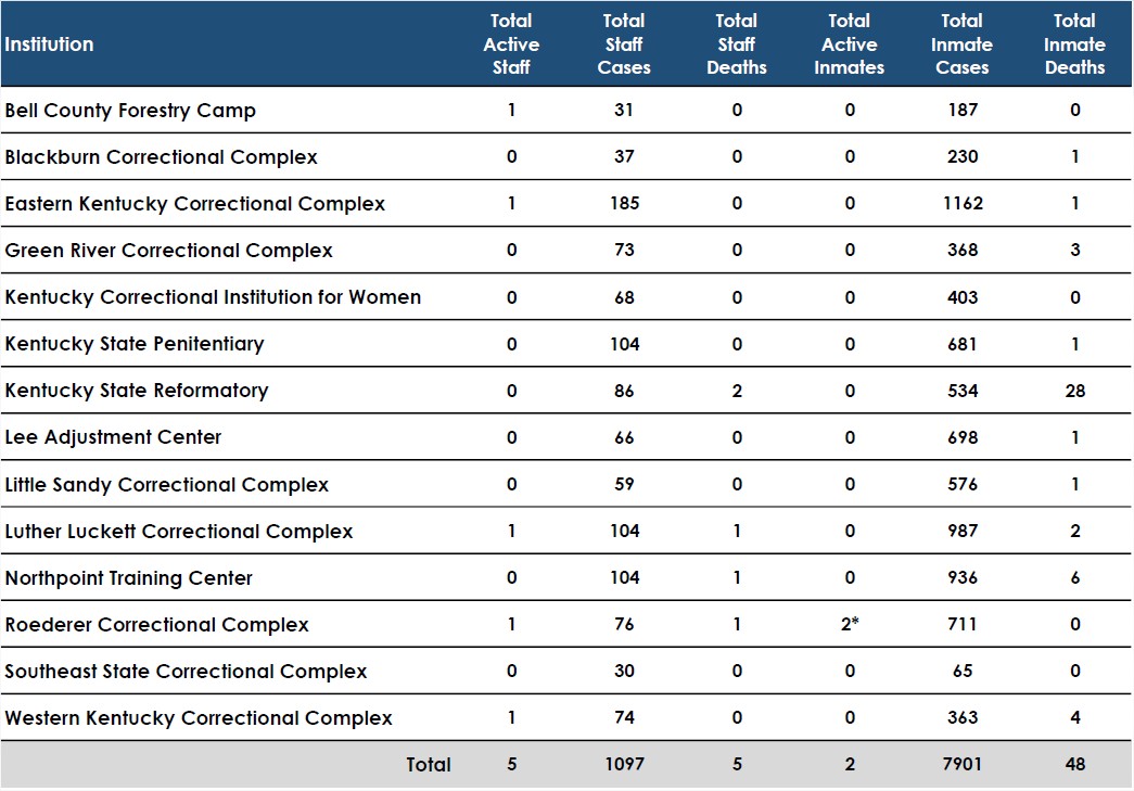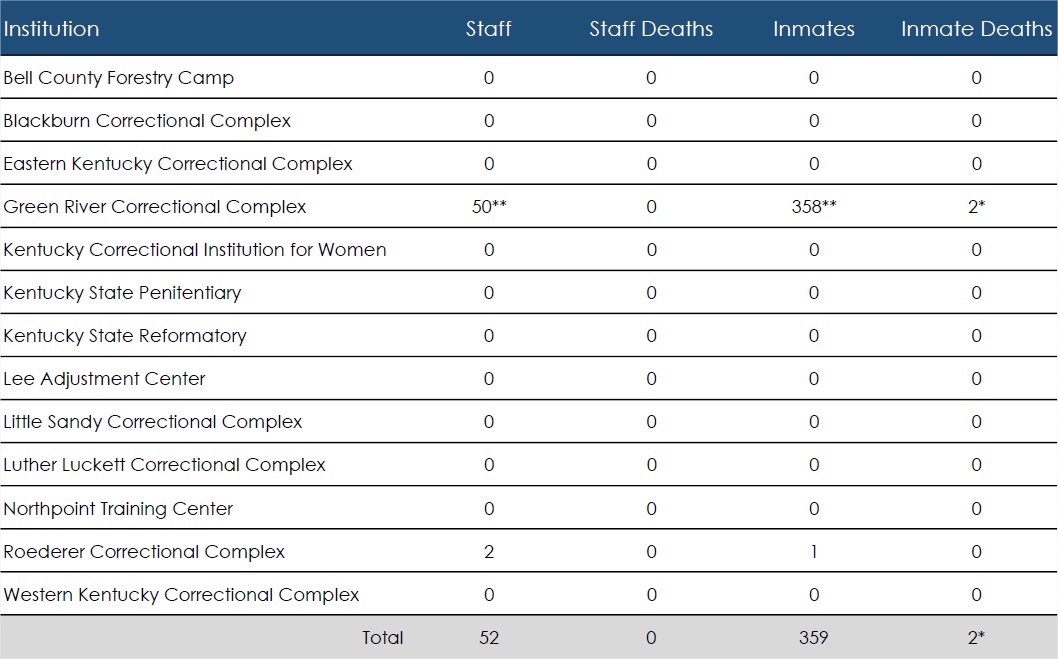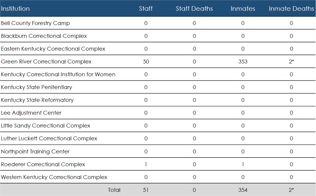 *An individual passed away at Green River Correctional Complex on Sunday, May 3. He tested positive for COVID-19 on April 28, but an autopsy has been performed and the exact cause of death is pending.