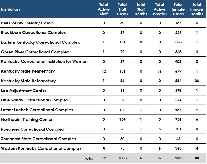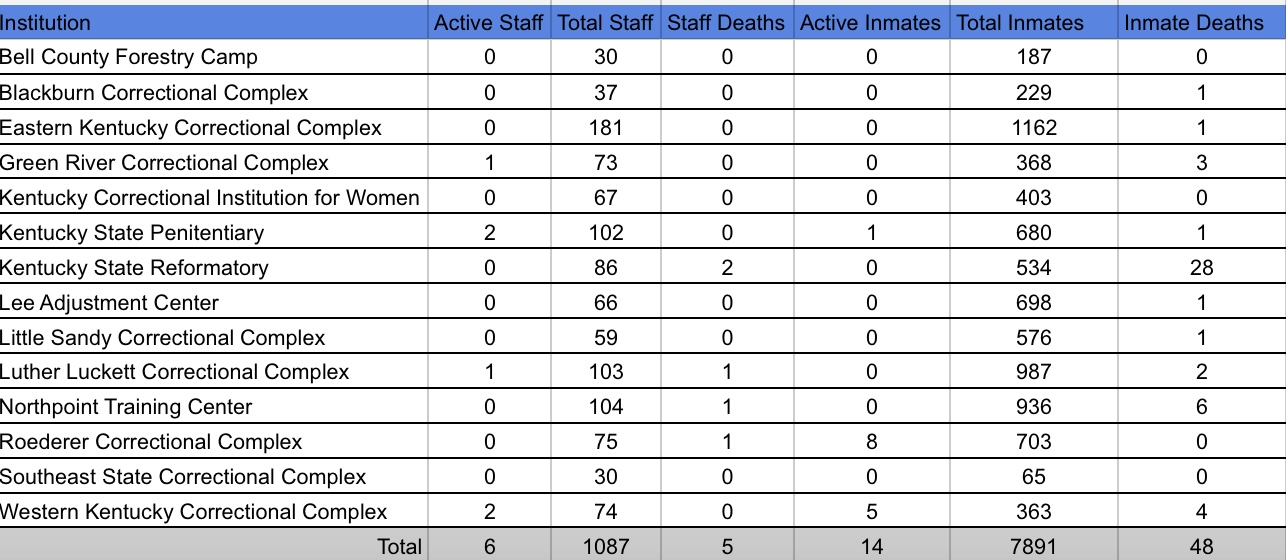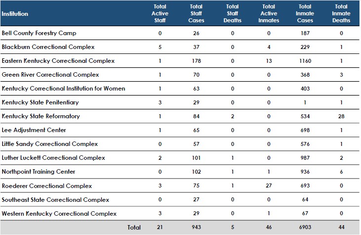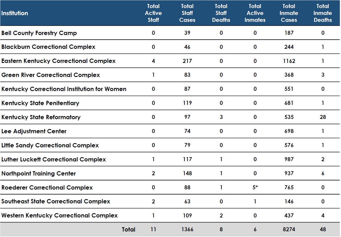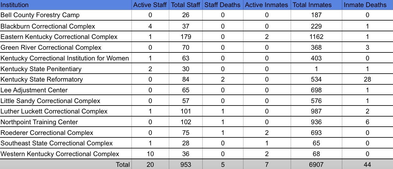 *An individual passed away at Green River Correctional Complex on Sunday, May 3. He tested positive for COVID-19 on April 28, but an autopsy has been performed and the exact cause of death is pending.