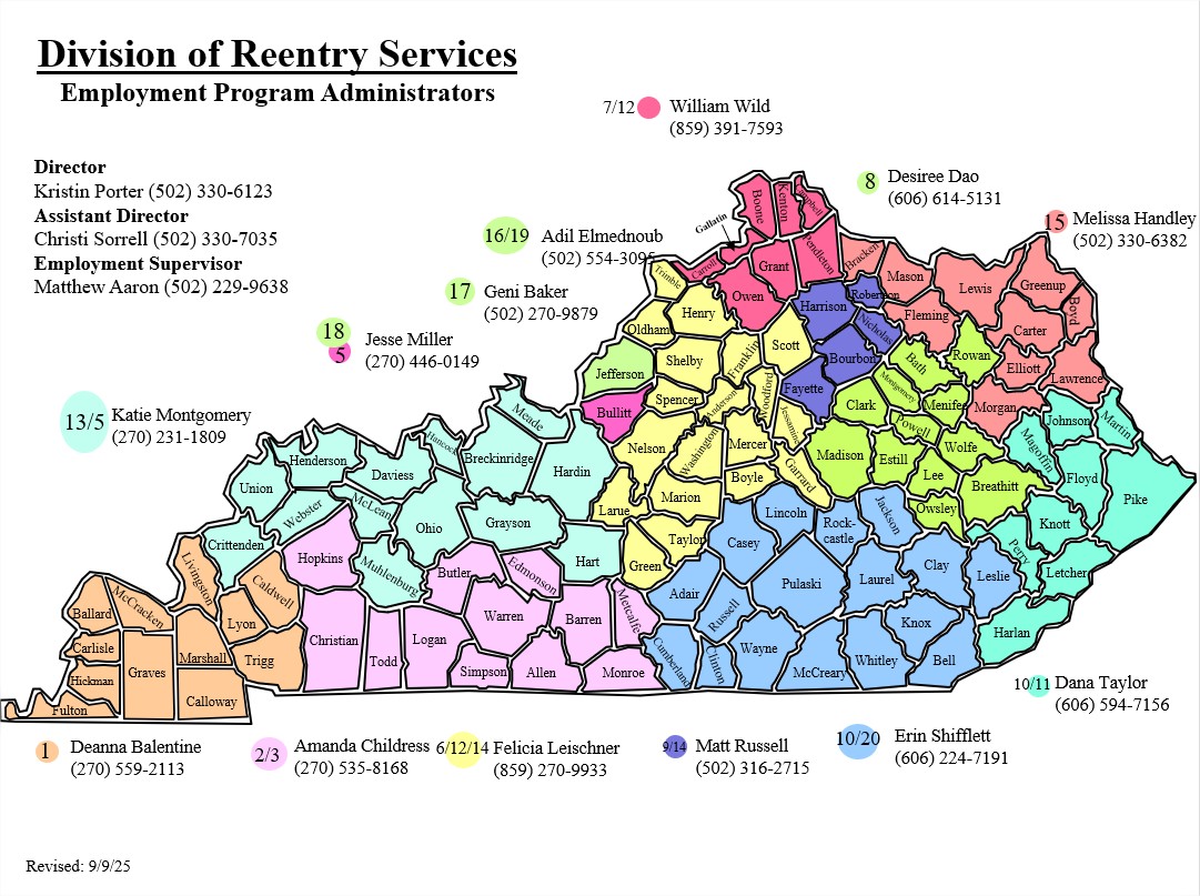 The Division of Reentry Services has 13 Employment Program Administrators who serve most counties in the state. They help with: